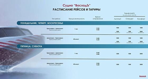 Планируете отправиться в мини-путешествие по Енисею и хотети иметь под рукой актуальное расписание и тарафы, то обязательно сделите за обновлениями на сайте. Билеты можно приобрести по ссылке.