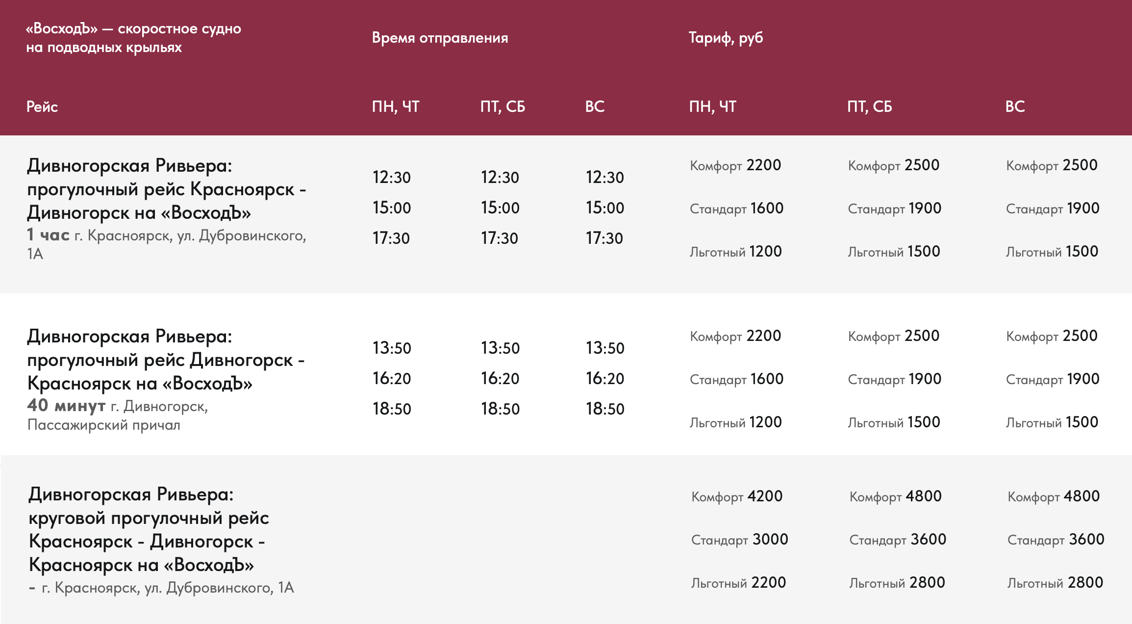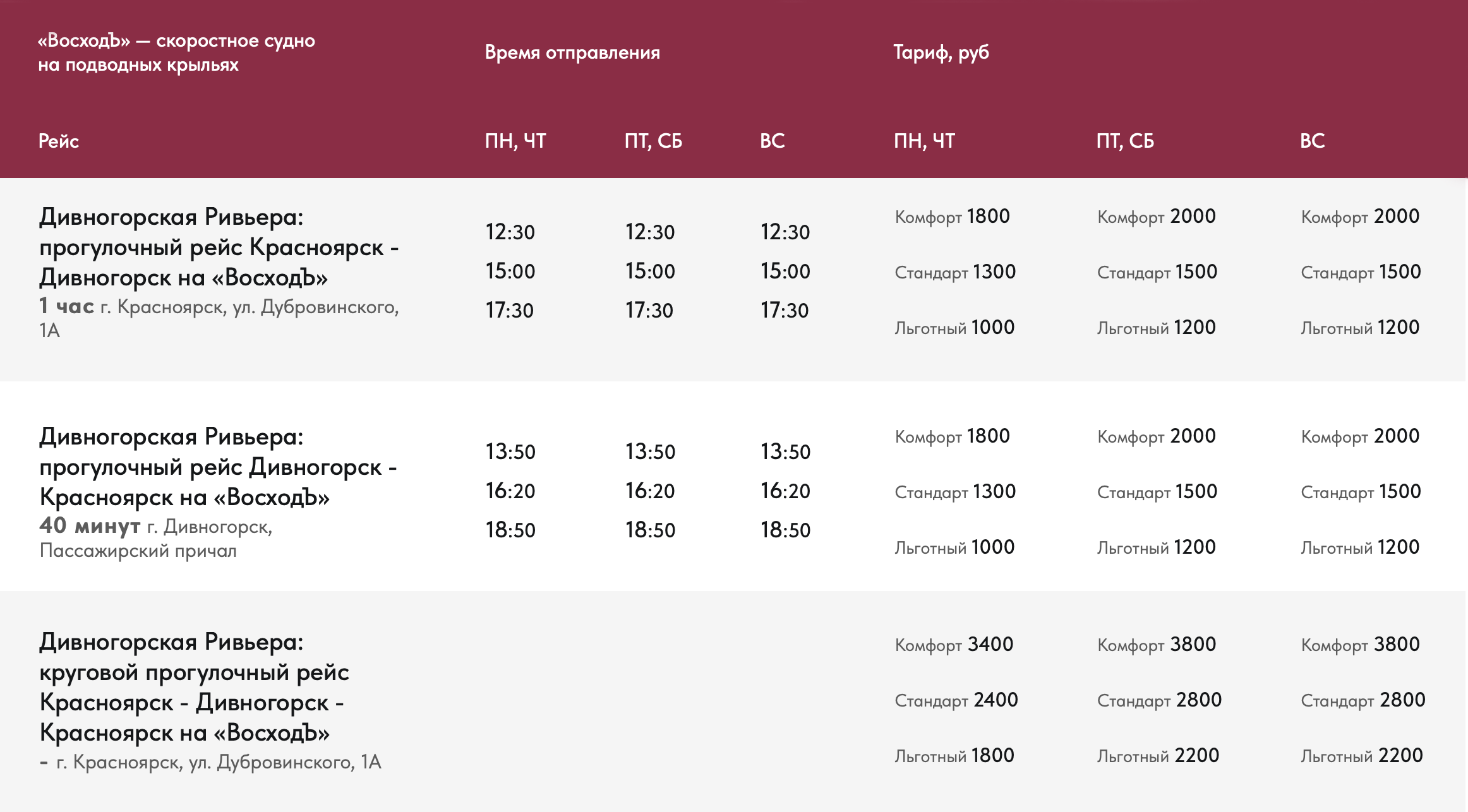 Планируете отправиться в мини-путешествие по Енисею и хотети иметь под рукой актуальное расписание и тарафы, то обязательно сделите за обновлениями на сайте. Билеты можно приобрести по ссылке.